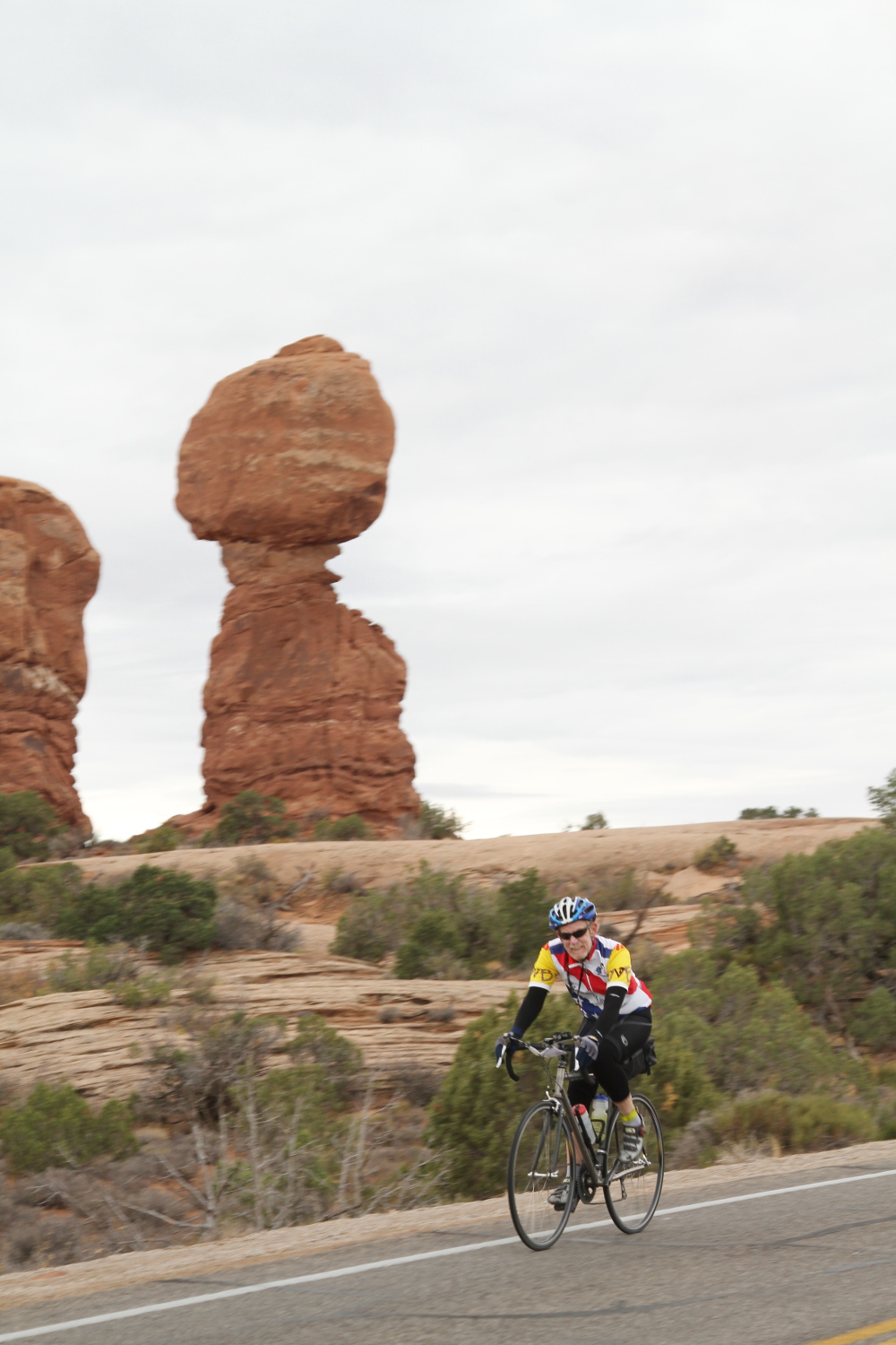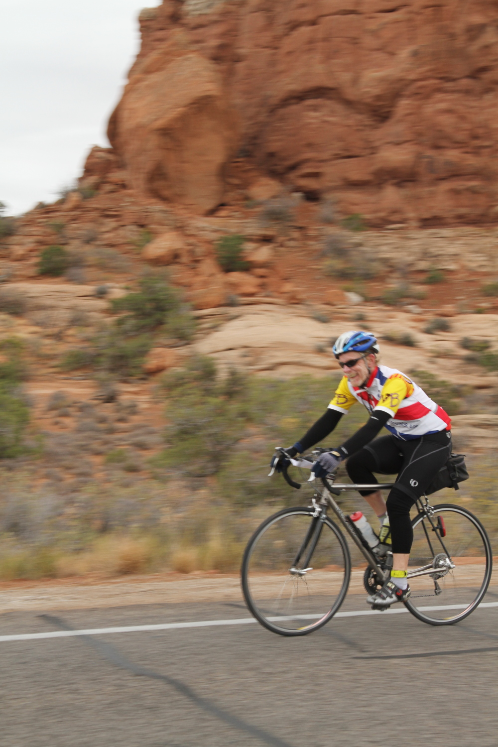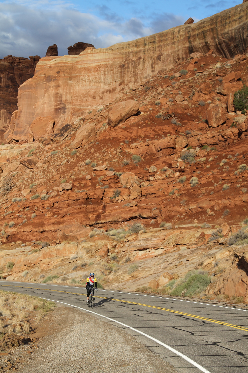 On October the 13th we had the Moab brevet. This year, we offered two distances…the standard 200km and a shorter 109km Populaire. Both distances shared the same route, but the Populaire simply turned around earlier, before going into Canyonlands National Park. The temperatures were rather cool, starting out at about 47F, raising to only 65F in the afternoon. It was cloudy in the morning, but later gave way to a sunny, but cool day.