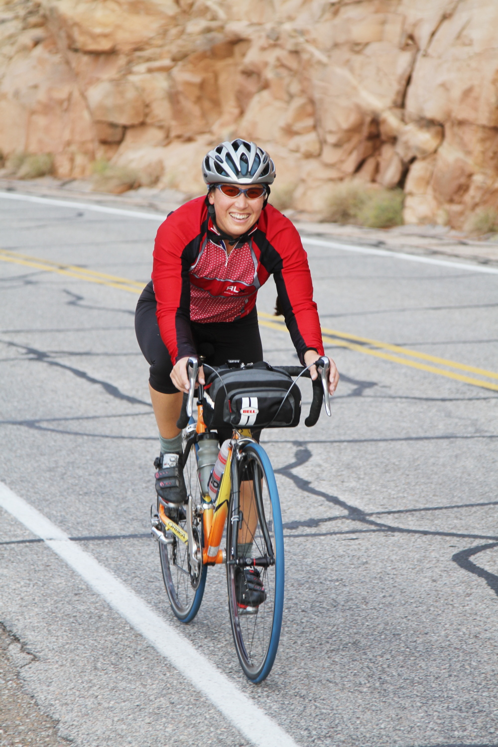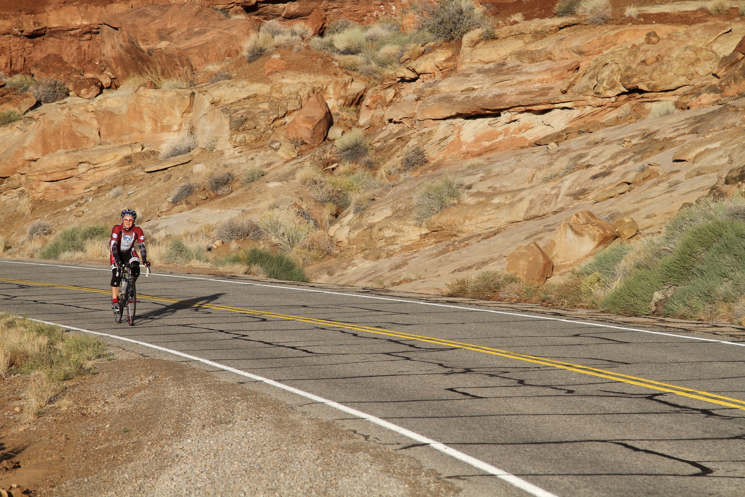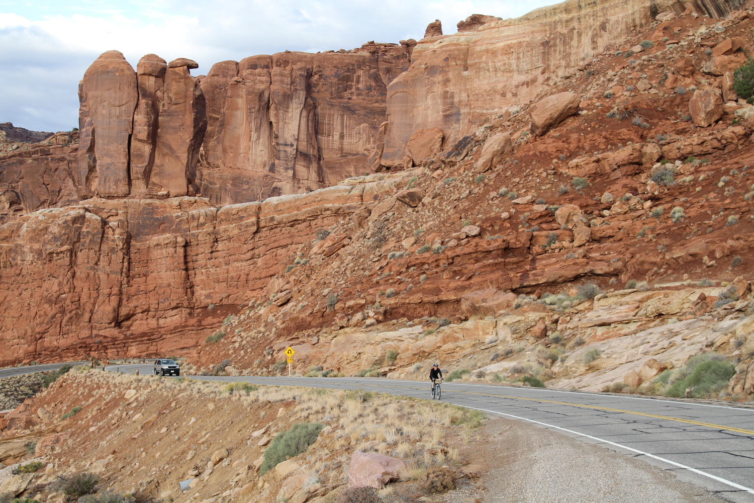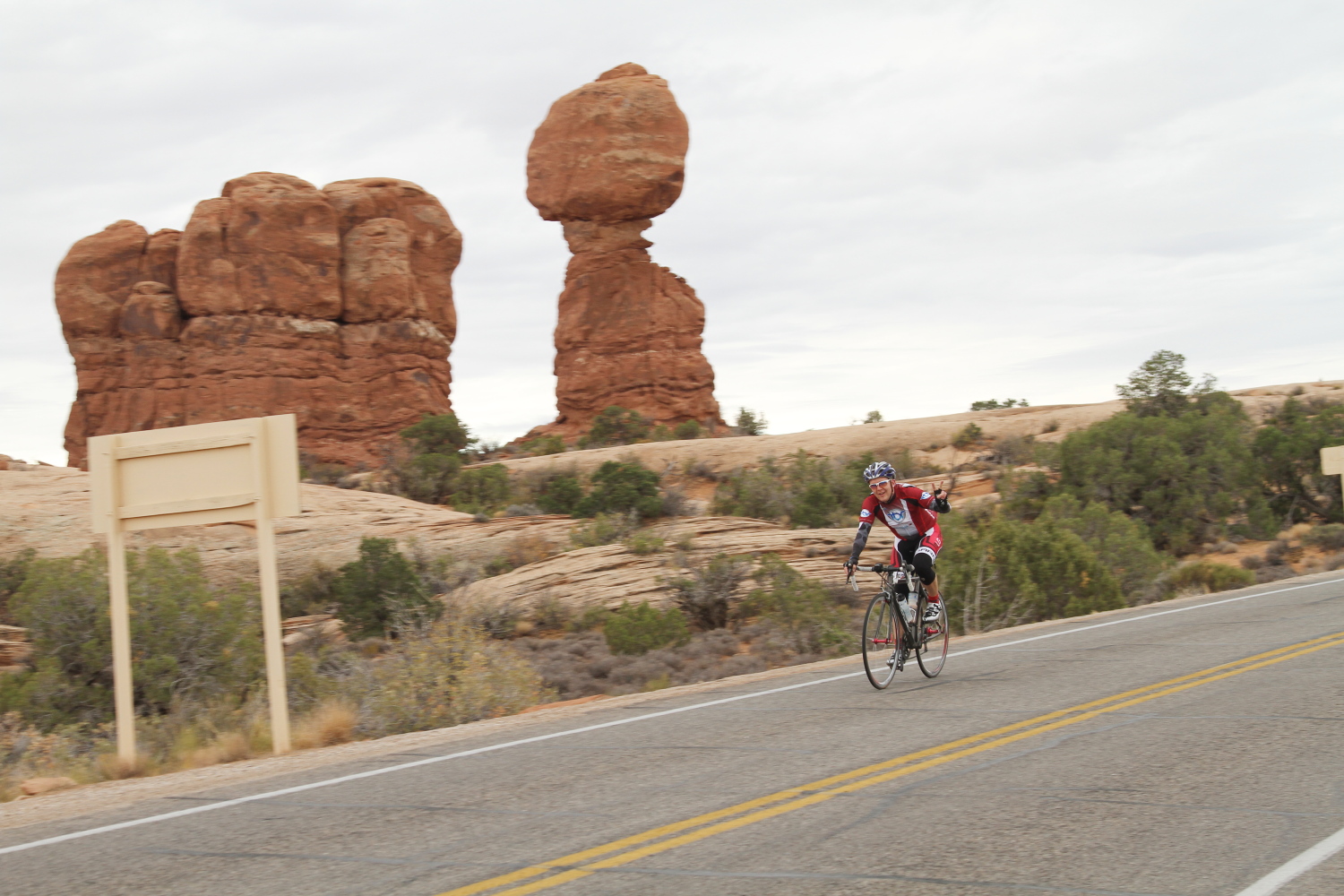 On October the 13th we had the Moab brevet. This year, we offered two distances…the standard 200km and a shorter 109km Populaire. Both distances shared the same route, but the Populaire simply turned around earlier, before going into Canyonlands National Park. The temperatures were rather cool, starting out at about 47F, raising to only 65F in the afternoon. It was cloudy in the morning, but later gave way to a sunny, but cool day.